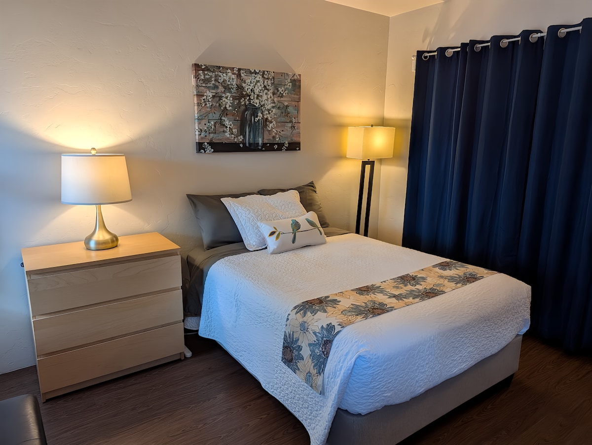 Enjoy our thoughtfully appointed bedroom and bath, peacefully nestled just footsteps from shopping and restaurants at Grant and Swan. Relax on your own private patio with firepit and grill, facing the scenic Catalina Mountains. No-hassle features include private entrance and your own off street parking, an easy stroll to Starbucks, Trocadero Cafe, Tribute Bar & Grill, Trader Joe's and Crossroads Plaza, minutes west of Tucson Medical Center. Upgraded WiFi!