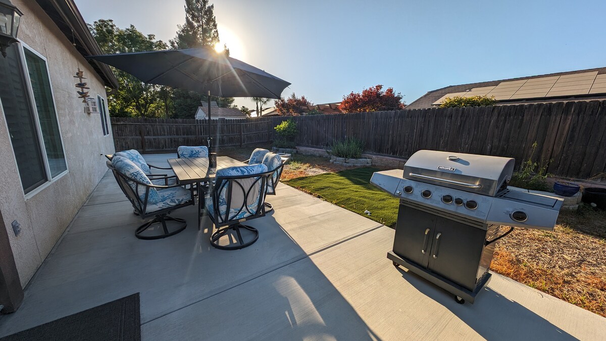 Letha wonke umndeni kule ndawo enhle enendawo enkulu yokuzijabulisa. 70” I-Smart TV, igumbi ngalinye eline-TV, amafeni asophahleni, ama-closet okungena, i-Inthanethi ye-Fiber engu-500, omatilasi be-memory foam Gel, imibhede ethokomele, ikhishi elinakho konke, i-gas BBQ grill, igceke elingemuva elivulekile, indawo ezungeze amadolobha amakhulu entsha, amakamelo okulala amane, namagumbi okugezela amathathu, asikho isidingo sokulinda. Itholakala kalula e-SE Visalia, imizuzu eya e-Super Walmart nase-Costco, imizuzu engu-20 ukuya e-AgExpo Center, nemizuzu engaba ngu-35 ukuya e-Sequoia National Park.