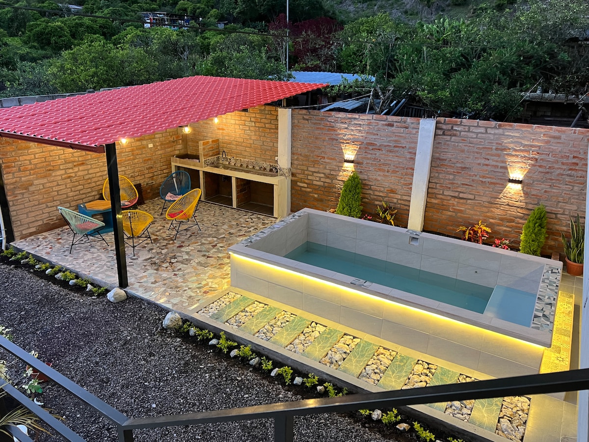 Indlu eyingqayizivele etholakala emizuzwini engu-10 ukusuka enkabeni yedolobha. Kule ndlu izivakashi zethu zizothola indawo enokuthula ezungezwe izimbali nendawo enkulu lapho ungahlangana khona nabangane noma umndeni. Amasevisi ethu ahlanganisa: indawo yokubilisa inyama, indawo yokubhukuda enamatshe eningiliziwe, ubhavu wamanzi ashisayo nokupaka emagcekeni. Amakamelo avulekile futhi anakwa kakhulu ukuze ujabulele futhi uzizwe usekhaya. Umgomo wethu ukuqinisekisa ukuthi ukuhlala kwakho e-Banos kufanelekile ukukhunjulwa isikhathi sokuphila.