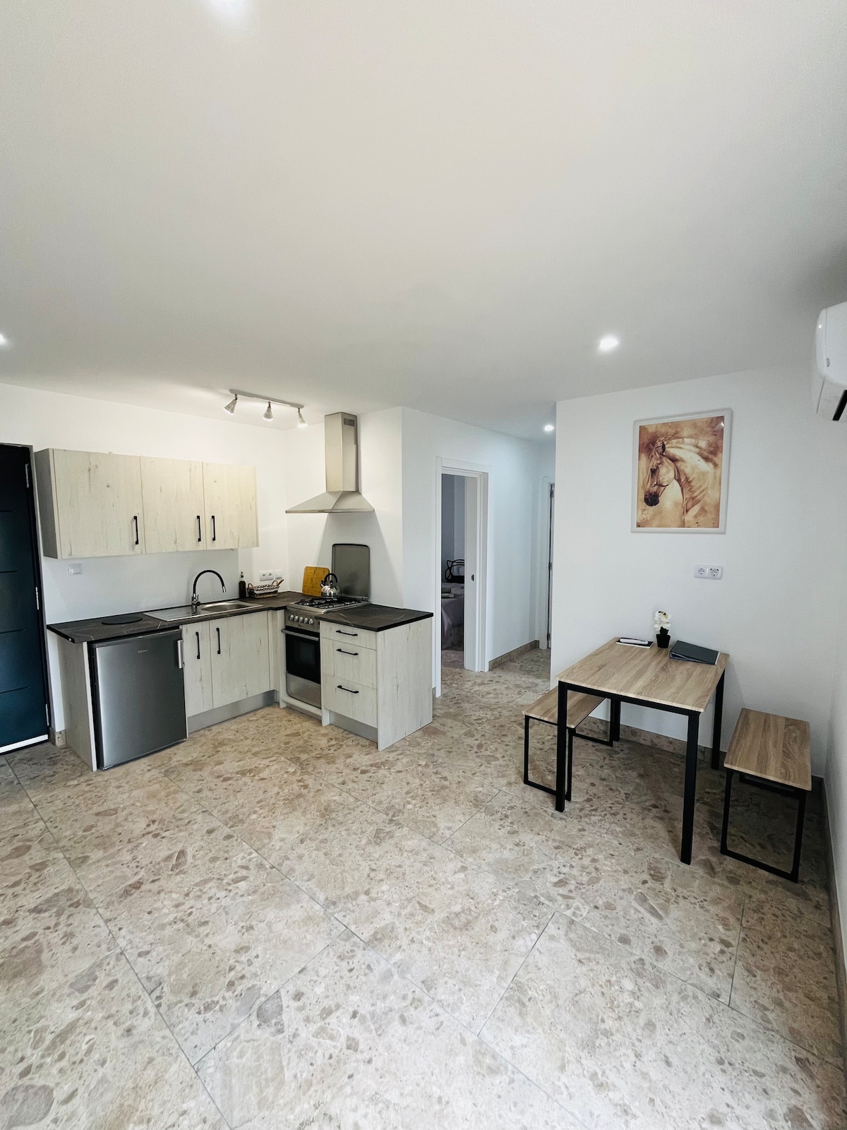 Jabulela ngokuthula nangokuthula! Ifulethi elihle. Ukunethezeka kuphela.... Ikhishi elisha linakho konke ukunethezeka, umbhede wasentwasahlobo we-XL owenziwe ngokotini oqhekekile ne-air conditioning. Ngaphandle kwethala eliphrayivethi elingengaphansi kuka-50 m², elizungezwe iminqumo nezihlahla zezithelo, endlini ebiyelwe ngokuphelele. Kuqhele ngamakhilomitha angu-6 ibhishi legolide, futhi liqhele ngamakhilomitha angu-2 ukusuka edolobhaneni. Emini uzothola indawo ezungezile noma ujabulele ulwandle nelanga. Yibe usucwila endaweni yethu yokubhukuda entsha bese ugcina usuku ngewayini elimnandi.