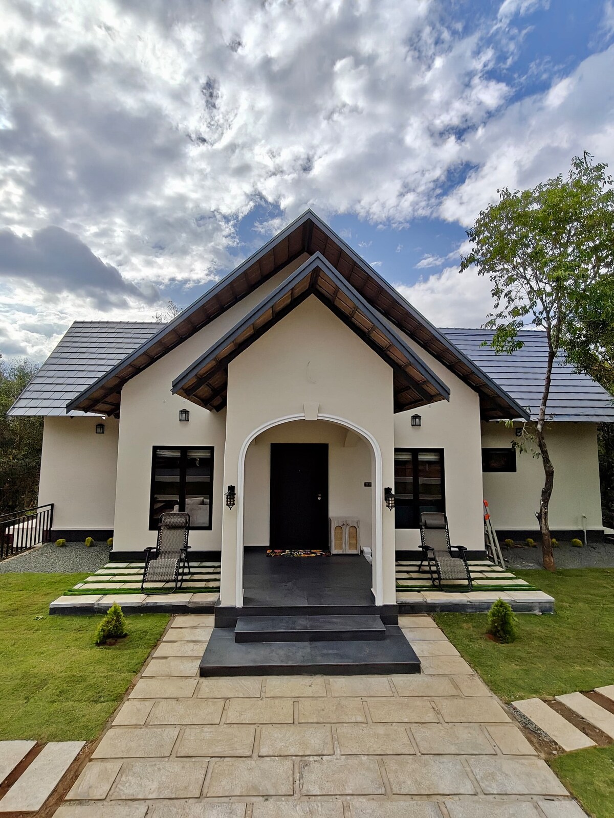 Indlwana yamatshe ephrayivethi yabantu ababili esentabeni enamahlathi engamamitha angu-1,005 e-Vagamon. Yake yaba yingxenye yezindlu zabasebenzi epulazini — izindonga zamatshe ezilungisiwe, ingaphakathi elilula, ubhavu ojulile, kanye ne-cabana yangasese yangaphandle ehlathini. Indawo ethulile kunazo zonke kule ndawo. I-Mountain Villa ayixhunyiwe kugridi: isebenzisa amandla elanga, ibhulakufesi yamahhala, ayinayo ithelevishini, inokuxhumana okulinganiselwe. Uhlobo lwendawo lapho usuku lunqunywa isimo sezulu nomuzwa, hhayi uhlelo.