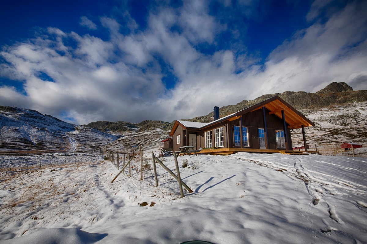 Indlu eyakhiwe ngamapulangwe esezintabeni e-Syndin e-Valdres