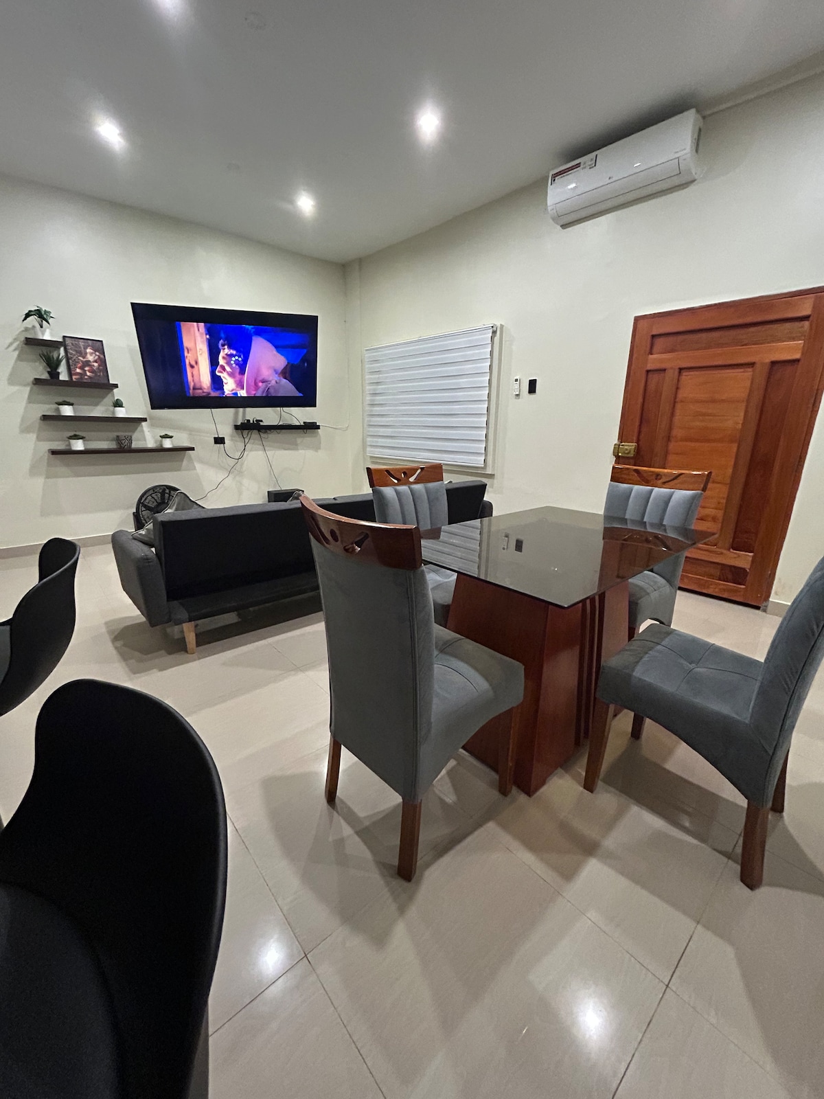 Apartamento de estreno, tranquilo y espacioso con wifi de fibra óptica (alta velocidad). Gran jardín exterior con áreas comunes para trabajar o descansar. Habitación con cama de 2 plazas y sofá cama. Posible agregar una cama de plaza y media. Mueble para trabajar y closet espacioso. Baño privado con excelente presión de agua, cocina amplia equipada con frigobar, cubiertos, platos y ollas. Mesa de comedor. A 10 min del centro de la ciudad y aeropuerto en transporte público (motocarro o taxi).