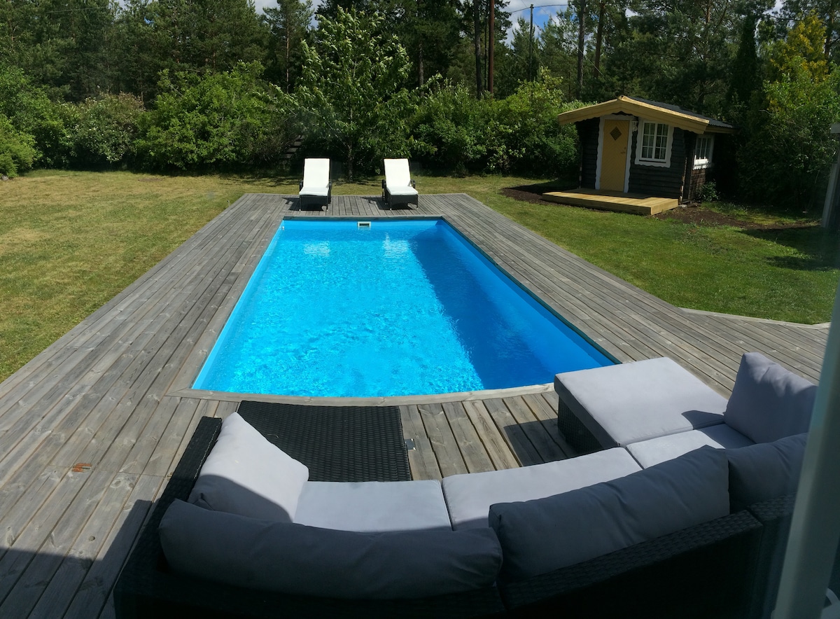 Villa med stor pool, uteplats med sol hela dagen, grill, Muurikka, pizzaugn, utekök/bar, soffgrupper, utegym, studsmatta, lekstuga. 3 sovrum, bäddsoffa på ovanvåningen, separat nyrenoverat gästhus. Rymligt hus med stora ytor. Ljudsystem i samtliga rum och utomhus. 2 badrum med jacuzzi och bastu i det stora badrummet. Mataffär runt hörnet, buss utanför huset. Parkering för upp till 3 bilar, elbilsladdare 16A för extra kostnad. 2km till centrum och badstrand. 30 min med bil till Stockholm