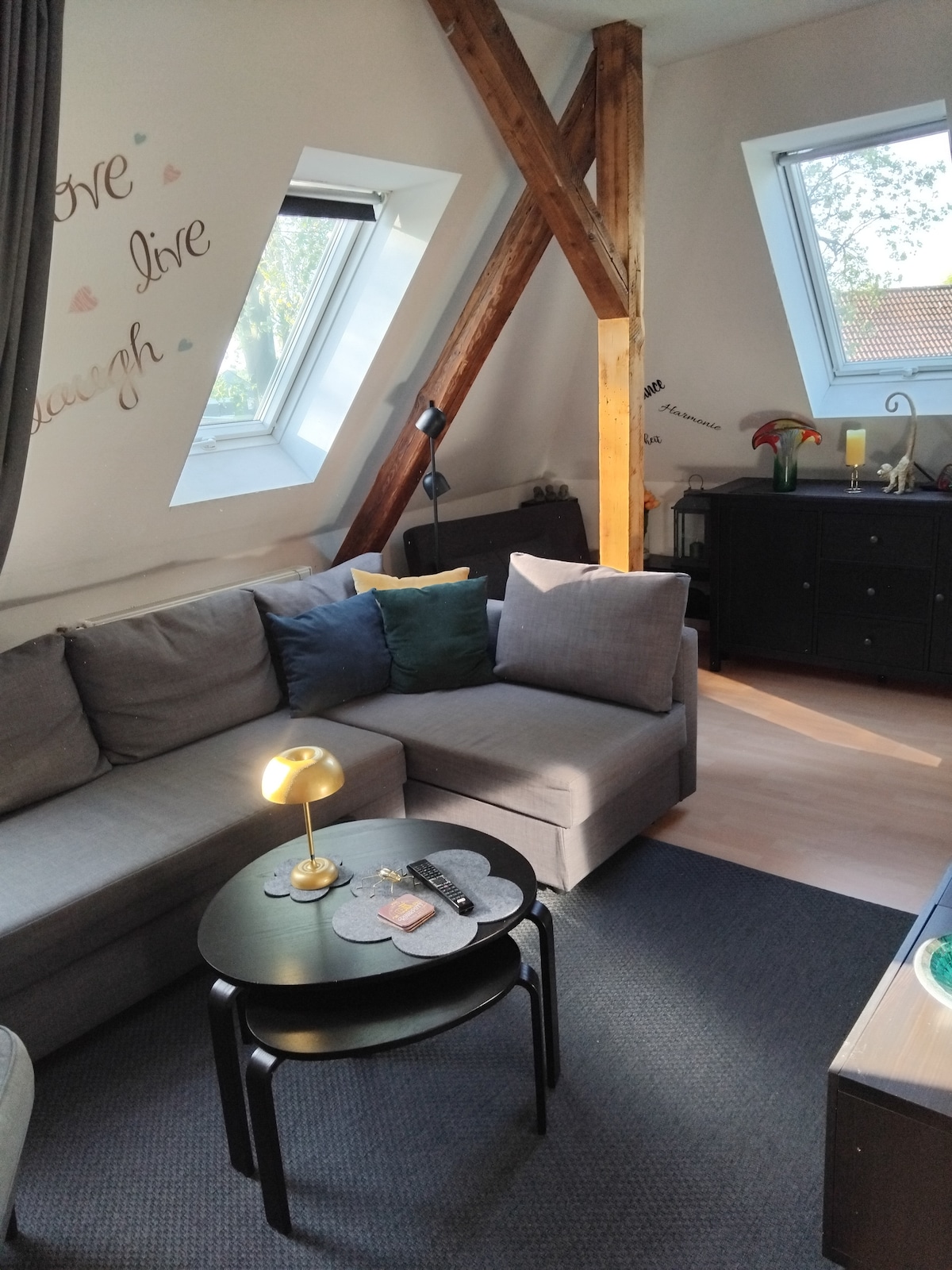 Ifulethi lethu elingasebenzi elinendawo yokungena ehlukile lisanda kulungiswa, linefenisha ephelele futhi linezinto zonke ezidingekayo. Ifulethi linegumbi lokugezela, ikhishi elincane elihlukile nendawo yokuhlala kanye nethala – elilungele abantu ababili, ngokuzikhethela abantu abane. Phakathi emaphandleni, manje usuvele edolobheni: Inkaba yedolobha lase-Hattingen ifinyelelwa emizuzwini embalwa ngemoto, i-Bochum-Linden nayo iqhele ngamakhilomitha angu-4 kuphela futhi ingaphansi nase-Ruhr.