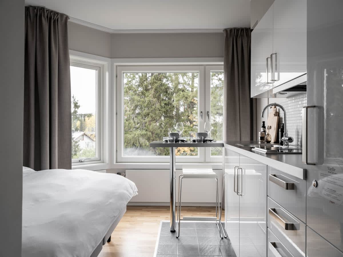 House (25 sqm). Private entrance, toilet, shower cabin & washing machine. The price includes bed linen, towels & final cleaning. One large room with a bed (140 cm), sofa (which can be used as a bed), desk. NO KITCHEN but there is a small refrigerator, micro & water boiler. As a hotel room - larger. Good storage and drying facilities. WIFI, TV with apple TV. Own part of patio. Not shoveled in winter. Parking space - by house. "Trixy" driveway up, due to road conditions.