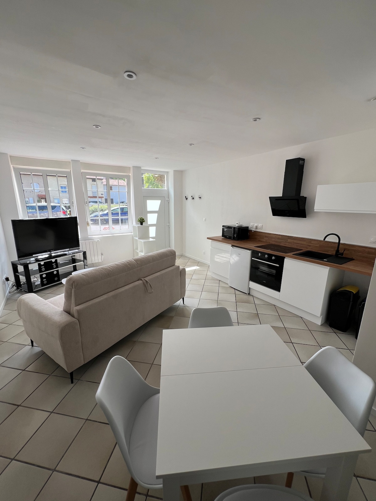 Logement complet. Entièrement équipé, lumineux et confortable, avec chambre séparé. L'appartement est en duplex. Au rez de chaussée vous trouverez la chambre, la salle de bain ainsi qu'un wc. La cuisine, le salon et la salle à manger se trouvent à l'étage. Peut accueillir un couple + 1 enfant. Situé au centre du village, avec la boulangerie à 50 mètres, et une épicerie bio à 100 mètres. Un snack kebab à 50 mètres. À 5 minutes de l’autoroute et 10 minutes de Creutzwald ou de Saint-Avold.