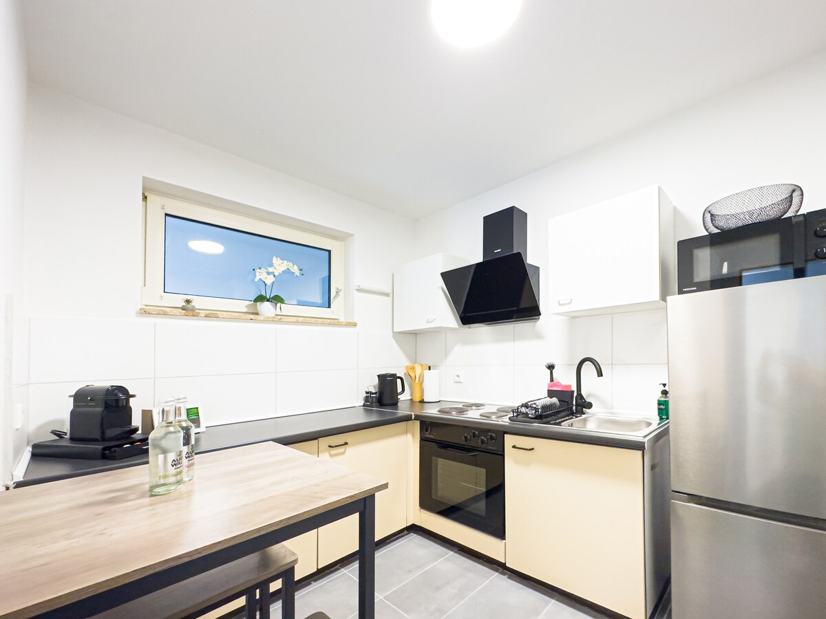 Leli fulethi elivalekile ( cishe. 20 mvele) lisesitezi esiphansi sendlu yethu elibheke egcekeni elingemuva. Ekamelweni kunombhede omkhulu olala abantu ababili ontofontofo ( 180 x 200 ) nendawo yokuhlala. Ephaseji eya egumbini lokugezela langasese, kunekhishi elinesiqandisi, isitofu kanye nohhavini. Indlu yethu itholakala ebangeni labahamba ngezinyawo (imizuzu engu-5) ukuya enkabeni yedolobha enakho konke okukhangayo, nemizuzu engu-10. ukuhamba ngezinyawo ukusuka esiteshini sesitimela esiyinhloko.
