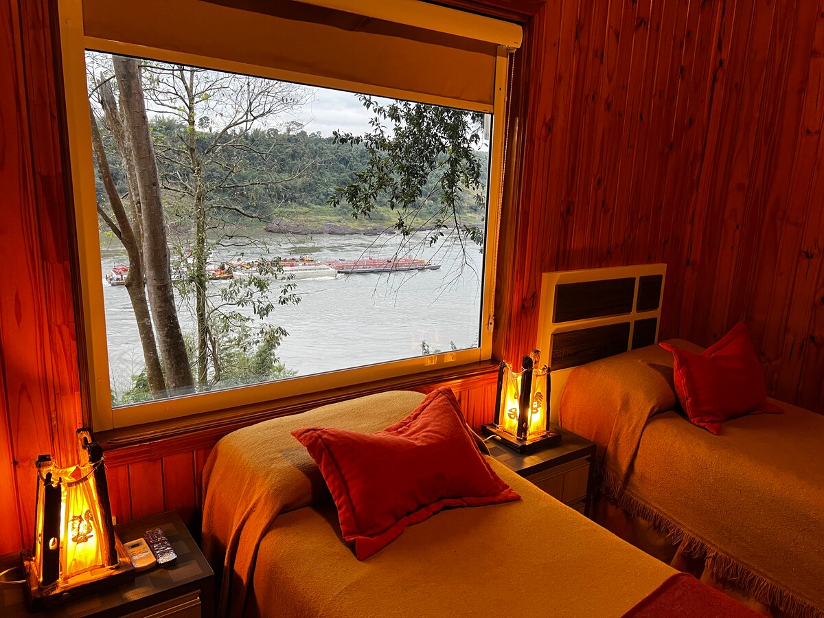 Vuka nsuku zonke uzungezwe imvelo. Indlu yethu engasemfuleni ihlanganisa ubukhulu, iphrayivesi, nendawo ehlukile ephakathi kwehlathi laseMisiones namanzi. Njengoba kunamagumbi okulala angu-2 anamagumbi okugezela, izindawo ezikhanyayo nomoya womndeni, ilungele amaqembu abangane, imindeni, izihambi ezifuna ukuphumula endaweni ethulile nemvelo. Jabulela ukubuka umfula lapho ungabona khona imingcele engu-3, ulalele imisindo yasehlathini futhi uphole endaweni yokubhukuda ehlanganyelwayo, ezungezwe izitshalo 🌳🌊