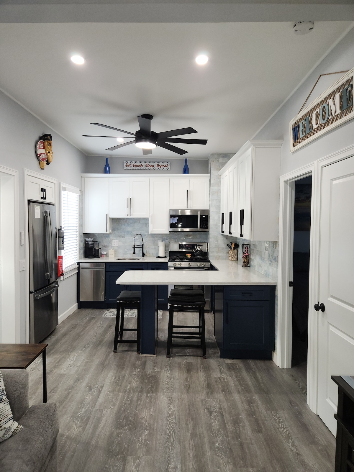 Le ndlwana enhle inezindawo zokubuka amanzi ezivela emagumbini amaningi. Isitezi sokuqala sinompheme wezinkathi ezingu-4, Igumbi lokuphumula livulekele amakhawunta ekhishi elimhlophe w quartz, indawo yokudlela , ikamelo lokulala kanye nobhavu ongu-1/2. Isitezi sesibili sinamakamelo angu-2 & ubhavu ophelele onezingubo zokuwasha. Ngaphandle uhlezi etafuleni elincane engadini engaphambili & izihlalo ze-Adirondack egcekeni elingemuva. 1/2 block eya ebhishi, i-kayak, ukudoba, ukuqaliswa kwesikebhe, i-cafe & izindawo zokudlela ezingu-2. Ikhaya lilungisiwe w uthando nokukhathalela. Awekho amaphathi. Sicela ucabangele umuntu ohlanzayo.