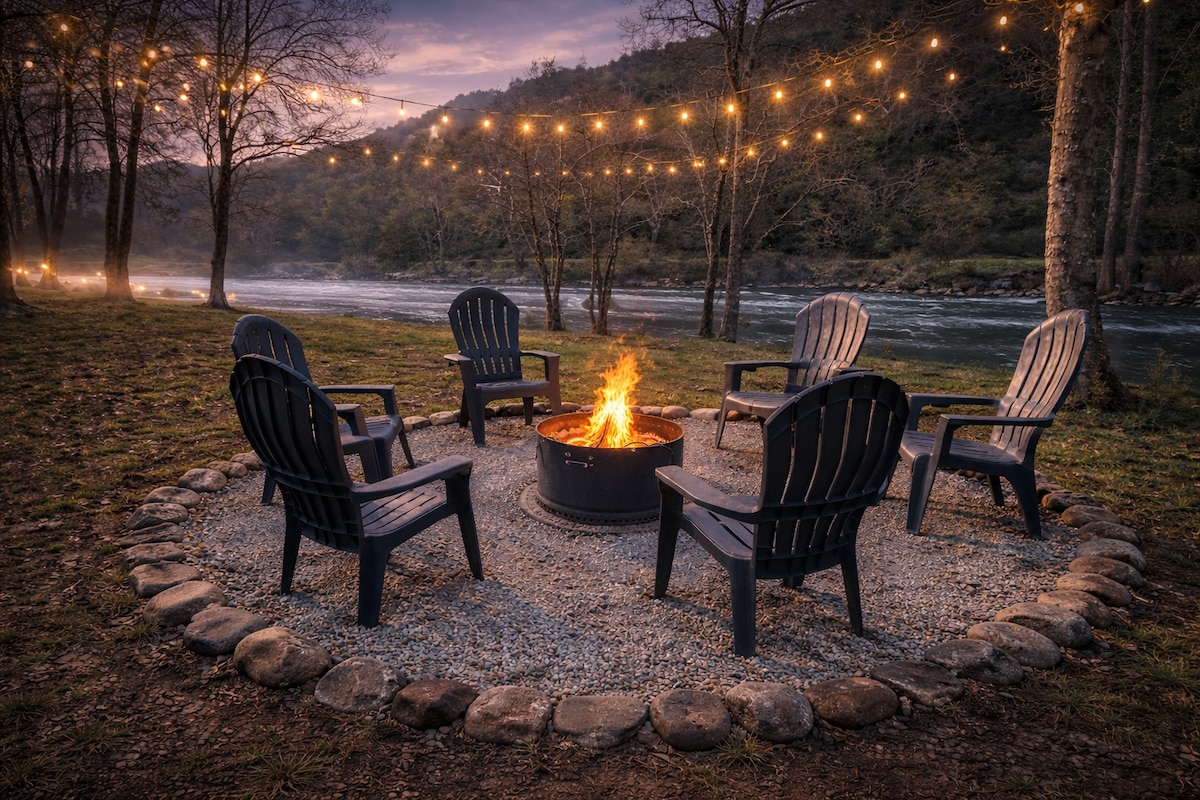 Yenza izinkumbulo ezithile kule ndlwana eyingqayizivele nelungele umndeni engaphambi komfula (Cishe u-1,700sf)! Letha isigxobo sakho sokudoba futhi uphumule! Sine-Kayaks namajazi okuphila atholakalayo lapho ucela ngaphandle kokukhokhiswa (amajazi okuphila adingekayo!). Jabulela isikhathi kuma-hammocks ngasemfuleni noma ungene kubhavu wamanzi ashisayo emphemeni ubheke umfula. Sicela uqaphele ukuthi sinekhamera yevidiyo ebheke endleleni yokungena imoto kanye nokubheka isitebhisi nebhange lomfula ngezansi kwendlwana yomfula.