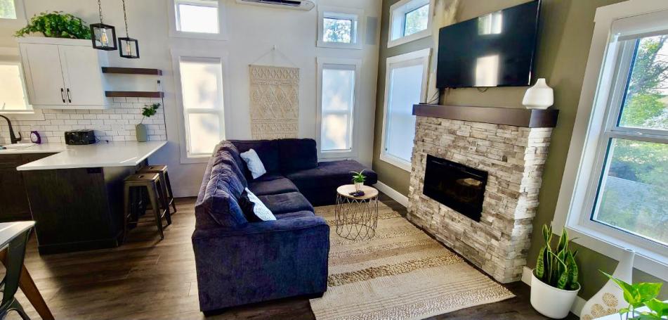 Indlwana enhle yesitayela sezwe enegceke elibiyelwe eliphrayivethi elinezindawo zokuhlala ezivikelwe ezinedekhi eceleni kwe-BR,i-pergola, ne-firepit. Le ndlwana inendawo evulekile yokudlela ekhishini, ama-BR angu-2 anemibhede emikhulu kanye negumbi lokugezela elingu-3pc.6 izinto zikagesi zesimanje, imizuzu engu-3 ukuya echibini ngezinyawo, imizuzu engu-7 ukuya e-Danceland, imizuzu engu-2 ukuya emzileni wokuhamba ngezinyawo. Silwela ukugcina indawo ene-hypo-allergenic: azikho izilwane ezifuywayo sicela, ukubhema ngaphandle kuphela. I-inthanethi ye-HS,I-WIFI,i-Smart TV, izindawo zokupaka mahhala Ukukhetha igalaji elihlukanisiwe.