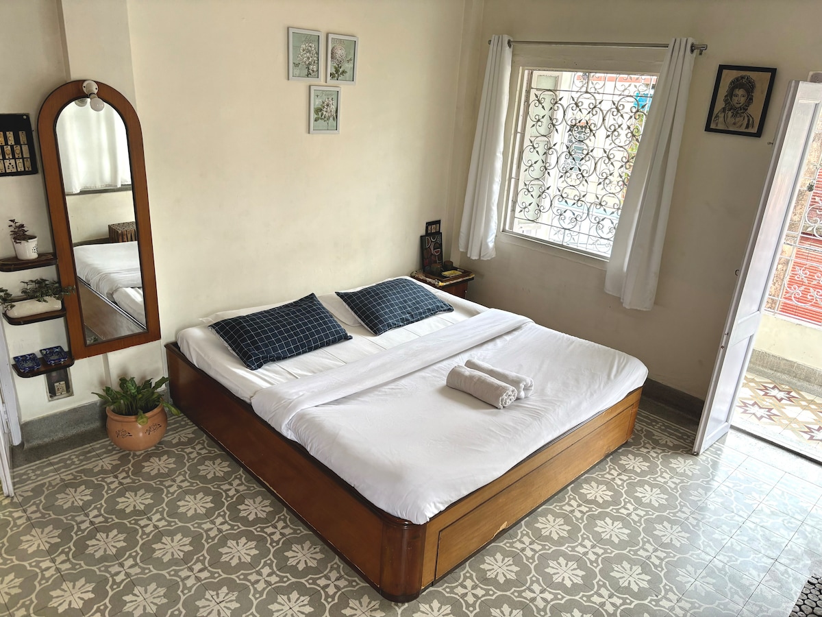I-Heritage Hideaway e-Kolkata: Thola indawo ethulile enkabeni ye-Kolkata endlini yethu yamagugu elungiswe ngothando. Leli kamelo elihle linikeza indawo yokuphumula ethulile phakathi nobuhle bakudala. Izici eziyingqayizivele: - Umbhede olala abantu ababili othokomele onamalineni ahlanzekile - Indlu yokugezela enegumbi lokugezela enezinto ezisemqoka zesimanje - Ifenisha yakudala namapulangwe - Ukukhanya kwemvelo okuthambile kungena Izindawo Ezihlanganyelwayo: - Indawo yokuhlala evulekile enemihlobiso emihle - Igceke elilungele ukuphumula - Ukudla kwasendaweni okuphekwe ekhaya kuyatholakala