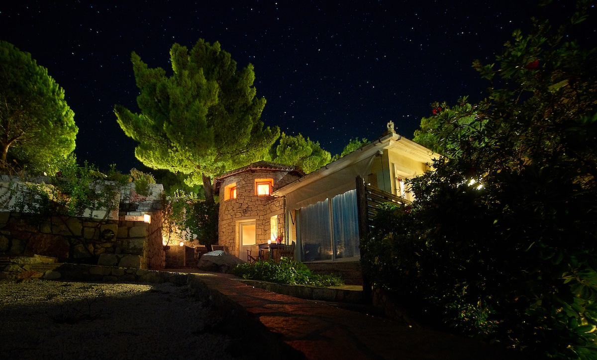 Uhlala endaweni enokuthula emahlathini. Ama-Poros, afinyeleleka kalula ezindaweni zokuphumula, izitolo namabha. Indawo yokubhukuda ephrayivethi endaweni enokuthula futhi ethulile eqhele ngamamitha angu-30 ukusuka ebhishi nenhlanganisela yokubuka ulwandle kanye nohlaza oluvundile. Indlwana enesitayela sendabuko enamakamelo angu-2, i-airconditioned ngokugcwele, amasevisi esimanje, izingubo zokuwasha, indawo ye-BBQ. Inezindawo eziphephile zokudlala zezingane futhi inemoto ephrayivethi yokupaka.