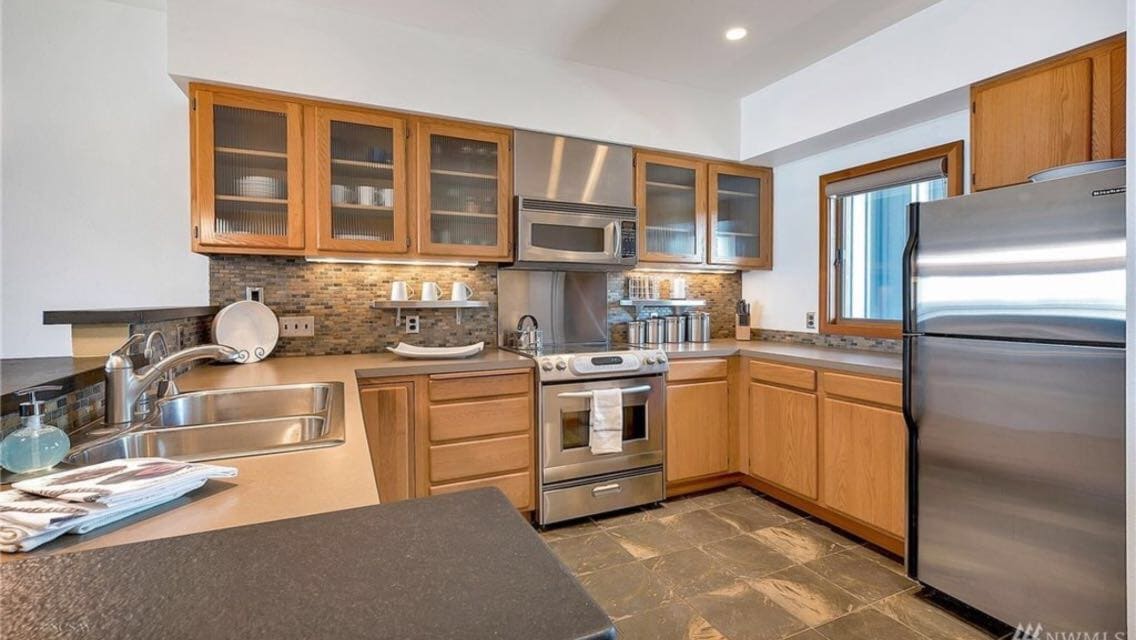 Sunsets over Bellingham Bay are something special as the sky lights up behind the San Juan Islands. Bocks from WWU. Walk to downtown or drive to Old Fairhaven Historic District! Clean & homey ... with two bedrooms (one queen and one Full bed) with private baths in each room. One bath contains a sauna shower for your relaxation! Fully stocked kitchen boasts all you need to serve up a meal! So much to see and do, day or night! Even by foot! Xtra fee for pups. Cement steps down to get to condo.