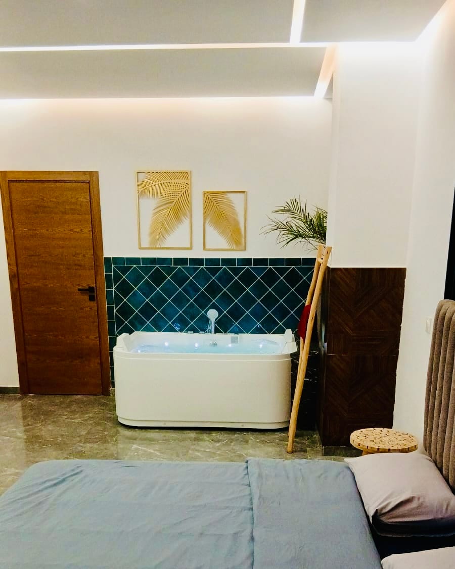 😍PERLE RARE FORMULE « APPARTEMENT 4chambres en résidence »•Capacité 7voyageurs +2sup POINTS FORTS : •JACUZZI 2 places •4 balcons •Toit terrasse privatisé •Matériel de sport •Internet Haut débit (fibre) •TV et IPTV dans les 4 suites •Climatisation et chauffage partout •Literie de qualité •Proche commodités/ à deux pas de l’Aéroport •Services externes : transfert aéroport, livraison de repas (Glovo), InDrive (Uber) •Options : petit déjeuner-plats marocains livrés-coursier-ménage