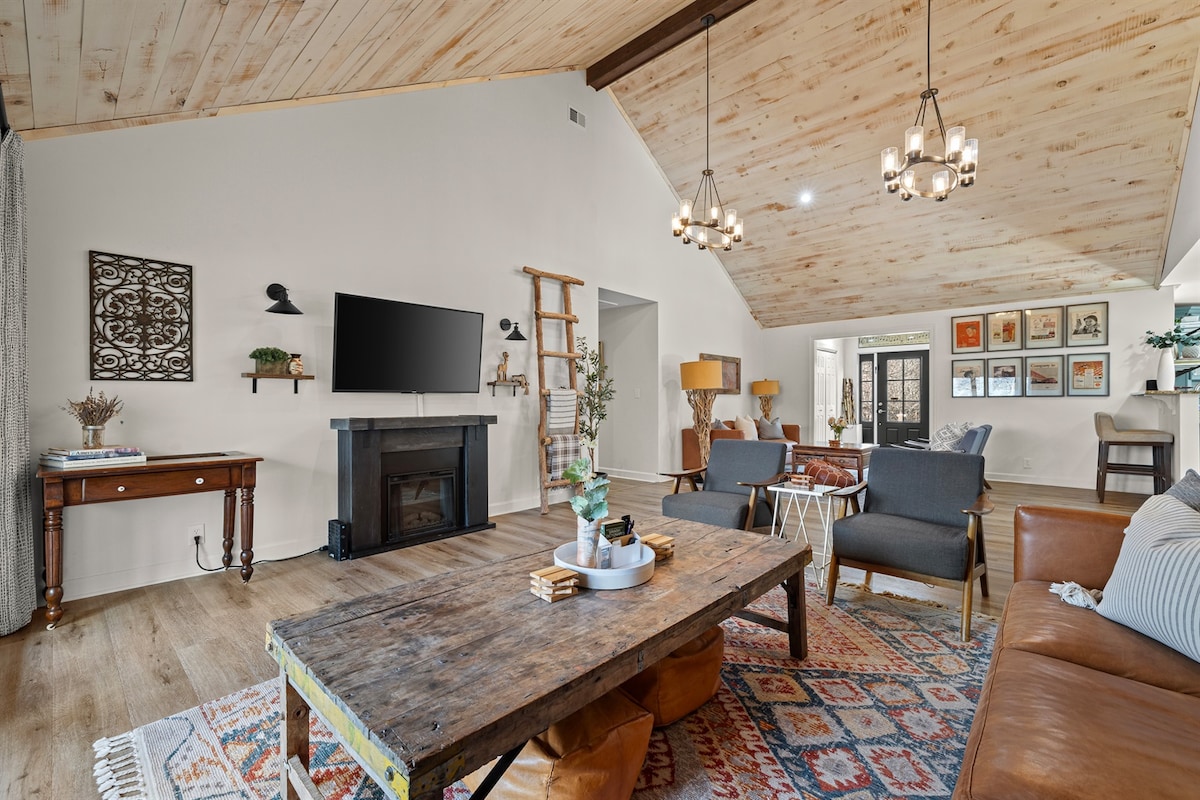Ikhaya elivulekile, linemibhede emisha ethokomele namashidi amasha. Igumbi lokulala elikhulu elinegumbi lokugezela, izikrini ezisicaba ezingu-5, i-WiFi esheshayo, i-Hulu TV, i-Bose Mini Speaker, i-FP, ikhishi elinakho konke okudingekayo eline-Caraway Cookware, i-waffle iron nama-Organic Pod. Bhaka inyama ugcinele ujabulelele ngokuvakasha kwakho kuvulande wethu omuhle ongu-Southern Bed Swing, izihlalo ezithokomele netafula lokudlela. Lenga ngasemgodini womlilo ezihlalweni ze-Adirondack. Izingane ziyayithanda i-tire swing & igceke elibiyelwe elingemuva. Ibanga elingamamayela angu-1 ukusuka ezitolo zokuthenga nasezitolo zokudlela. Indawo enhle yomndeni noma yohambo lwebhizinisi. Izibophezele ekwenzeni kahle!