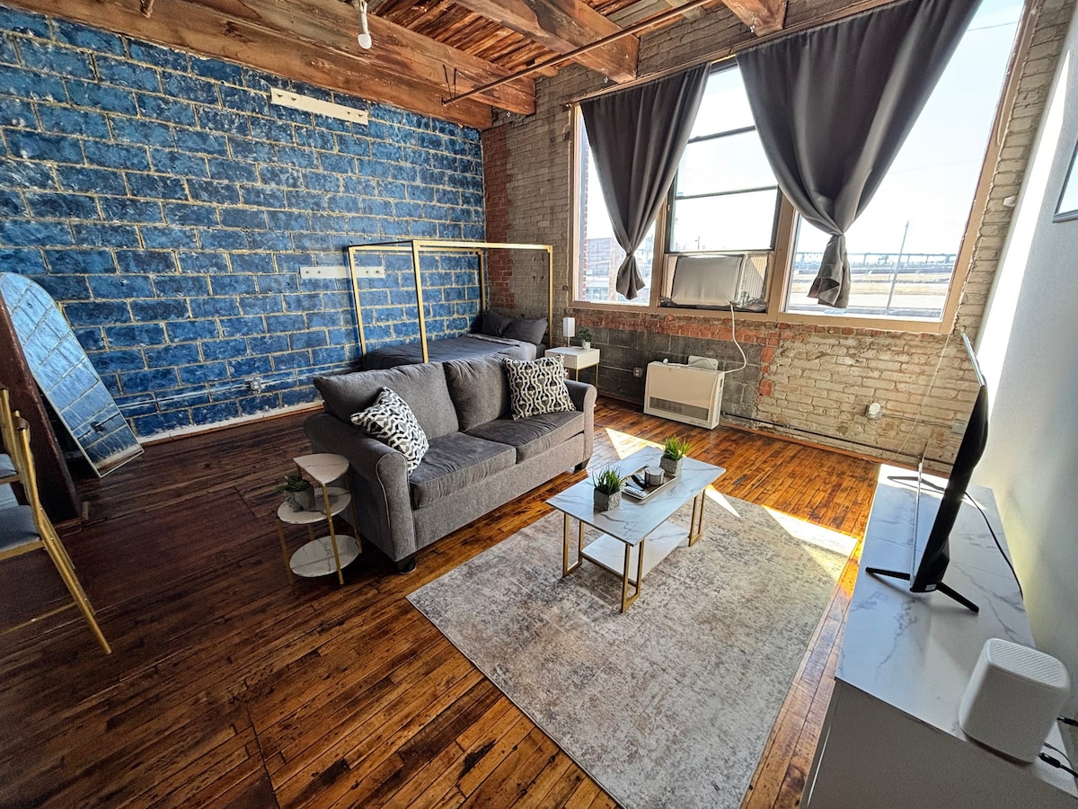Industrial studio just 5 minutes from Downtown Detroit in historic Corktown. Perfect for game days, concerts, or weekend trips—minutes from Ford Field, Comerica Park, and Little Caesars Arena. Walk to Michigan Central Station, Ralph Wilson Park, the Riverwalk, and top spots like Slows BBQ and Green Dot Stables. Includes a full-size bed, full kitchen, Smart TV, fast Wi-Fi, free parking, pull out sofa, and a 420-friendly environment that is next door to a dispensary. NO PARTIES