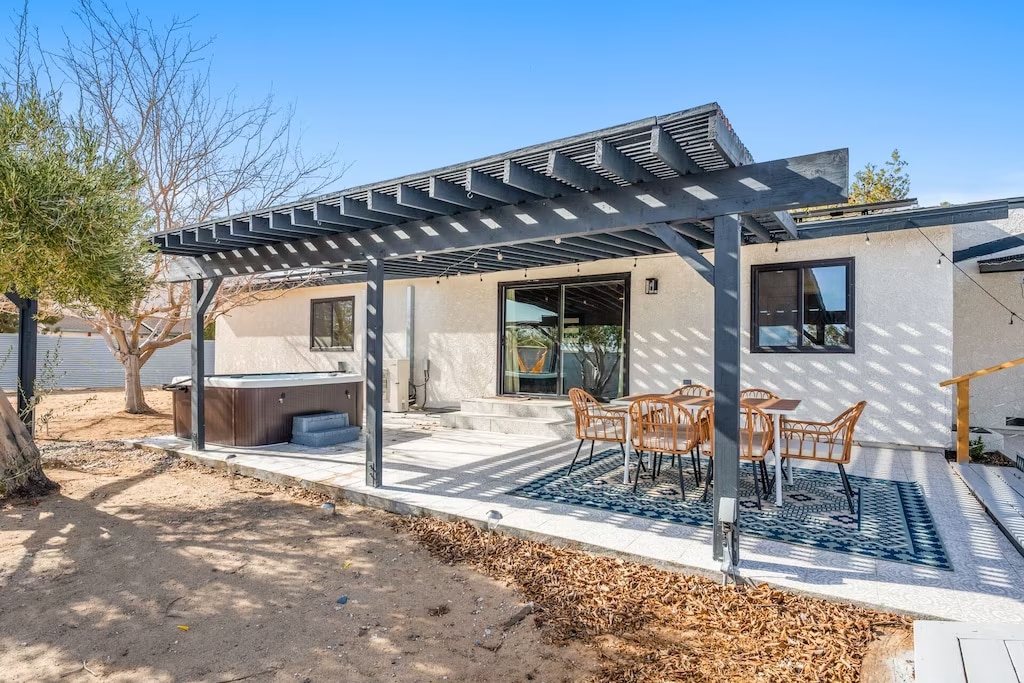 Dip into serenity at this secluded Desert Retreat 25min from JoshuaTree NP's new entrance. This remodeled 1959 STUNNER sits on 5 fenced acres of tranquil desert land, and offers majestic views of desert, mountains and STARS. 2b/2b king bed house with a detached game room/lounge building. Cozy up by the fire pit, Soak in the hot tub/pool, have a coffee or sip a cocktail from the covered patios. Bring your loved one(s) and get ready to unwind, reconnect, and enjoy the desert lifestyle.
