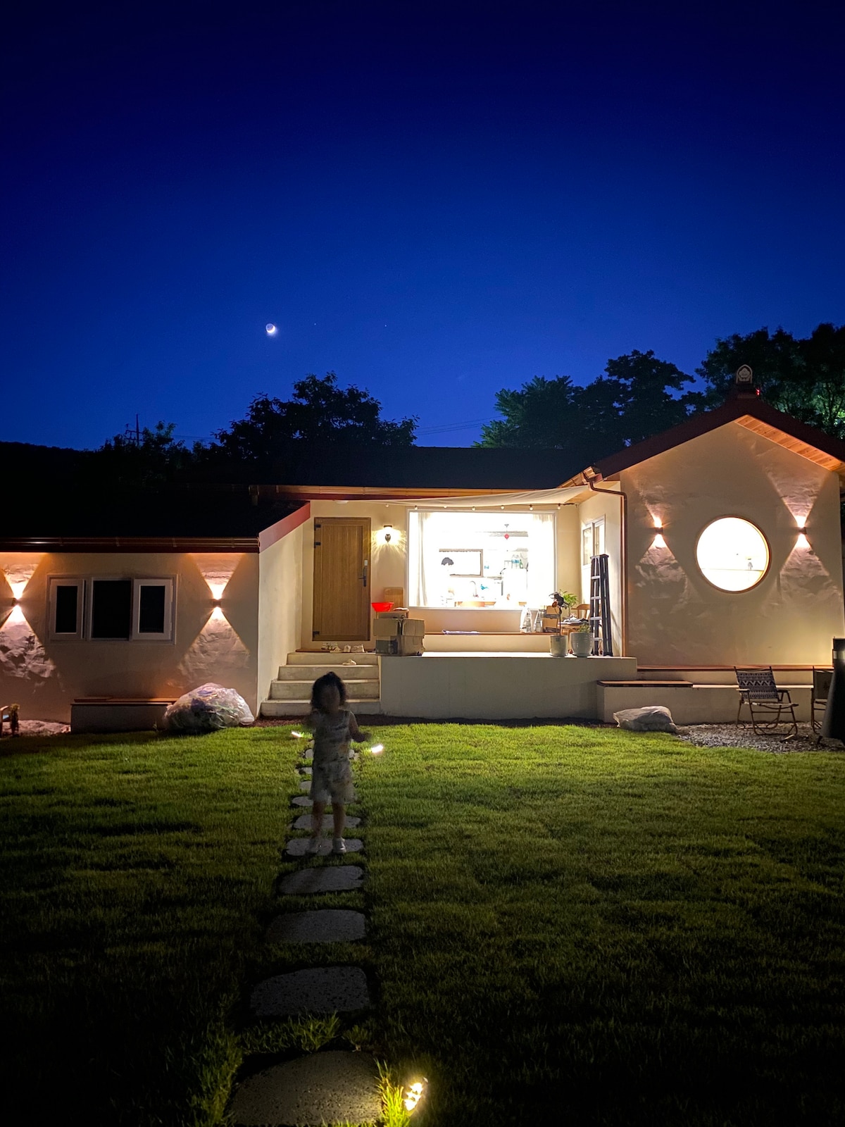 Indlu ethokomele nevumelanayo njengoba inyanga ibonakala echibini elithi 'Woldanghwaok'