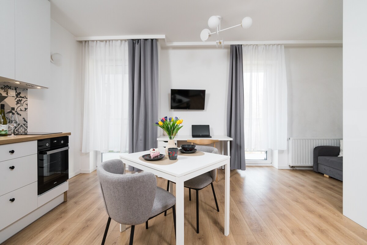 Ifulethi elithokomele, elinakho konke elinovulande, elidizayinelwe ukuhlala kwesikhathi eside e-Krakow. Indlela yokuhlela ecatshangwe kahle nokuqedelwa kwesimanje kuqinisekisa ukuthokomala kwansuku zonke – ikhishi elisebenzisekayo elakhelwe ngaphakathi, indawo yokuhlala ethokomele enosofa ophinde ube yindawo yokulala, indawo yokusebenzela, ne-Smart TV. Ibhalkhoni namafasitela abheke indawo enokuthula, eluhlaza, okukuvumela ukuba ujabulele iphrayivesi. Ilungele abantu abasebenzela ekhaya noma abafuna indawo yokuhlala ethokomele amasonto ambalwa noma izinyanga.